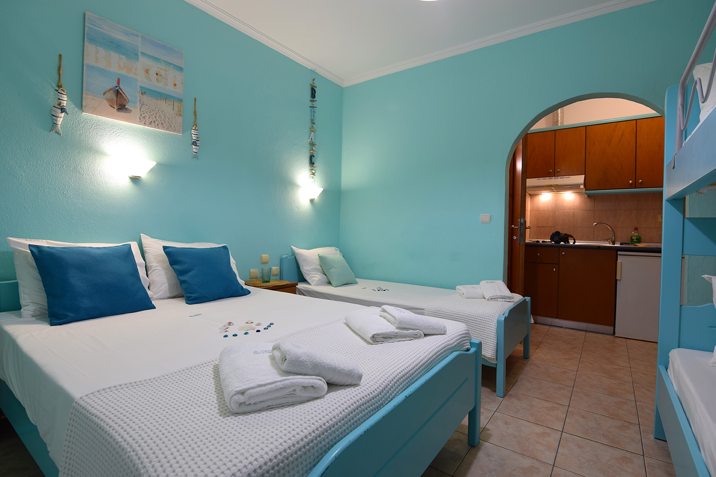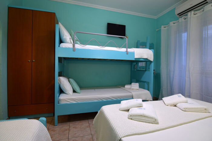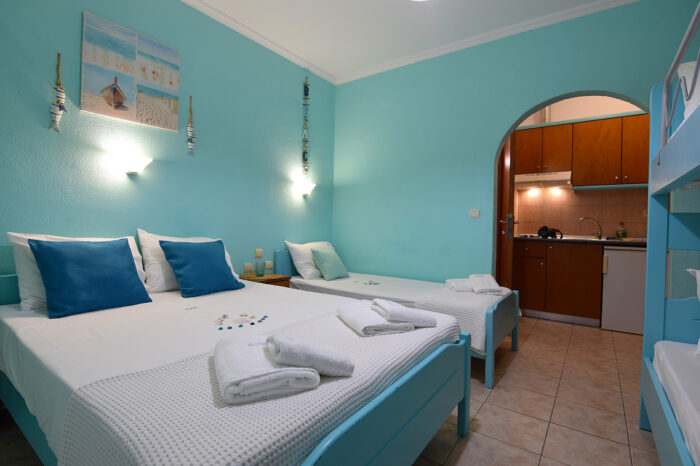 Ιδανικό για οικογένειες ή μεγαλύτερες ομάδες, αυτό το οικογενειακό δωμάτιο 24 τ.μ. προσφέρει άνεση, χώρο και ευκολία. Το δωμάτιο διαθέτει ένα διπλό κρεβάτι, ένα μονό κρεβάτι και μία κουκέτα, παρέχοντας δυνατότητα ύπνου για έως και πέντε άτομα. Η άρτια εξοπλισμένη κουζίνα περιλαμβάνει εστία μαγειρέματος, ψυγείο, μαγειρικά σκεύη και καφετιέρα/τσαγιέρα—ιδανική για την προετοιμασία γευμάτων κατά τη διάρκεια της διαμονής σας.